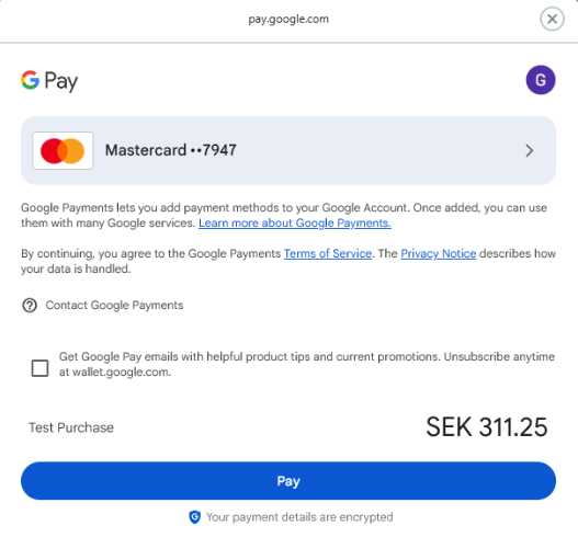 Screenshots 4 and 5 can be from Google Pay’s test environment, but since you are integrating through a third party (Swedbank Pay), you won’t be able to reach the Google Pay API Payment screen. In these cases, live purchases in a production environment is needed. To do that, our setup team needs to activate Google Pay and be provided with your Google Pay Merchant ID.